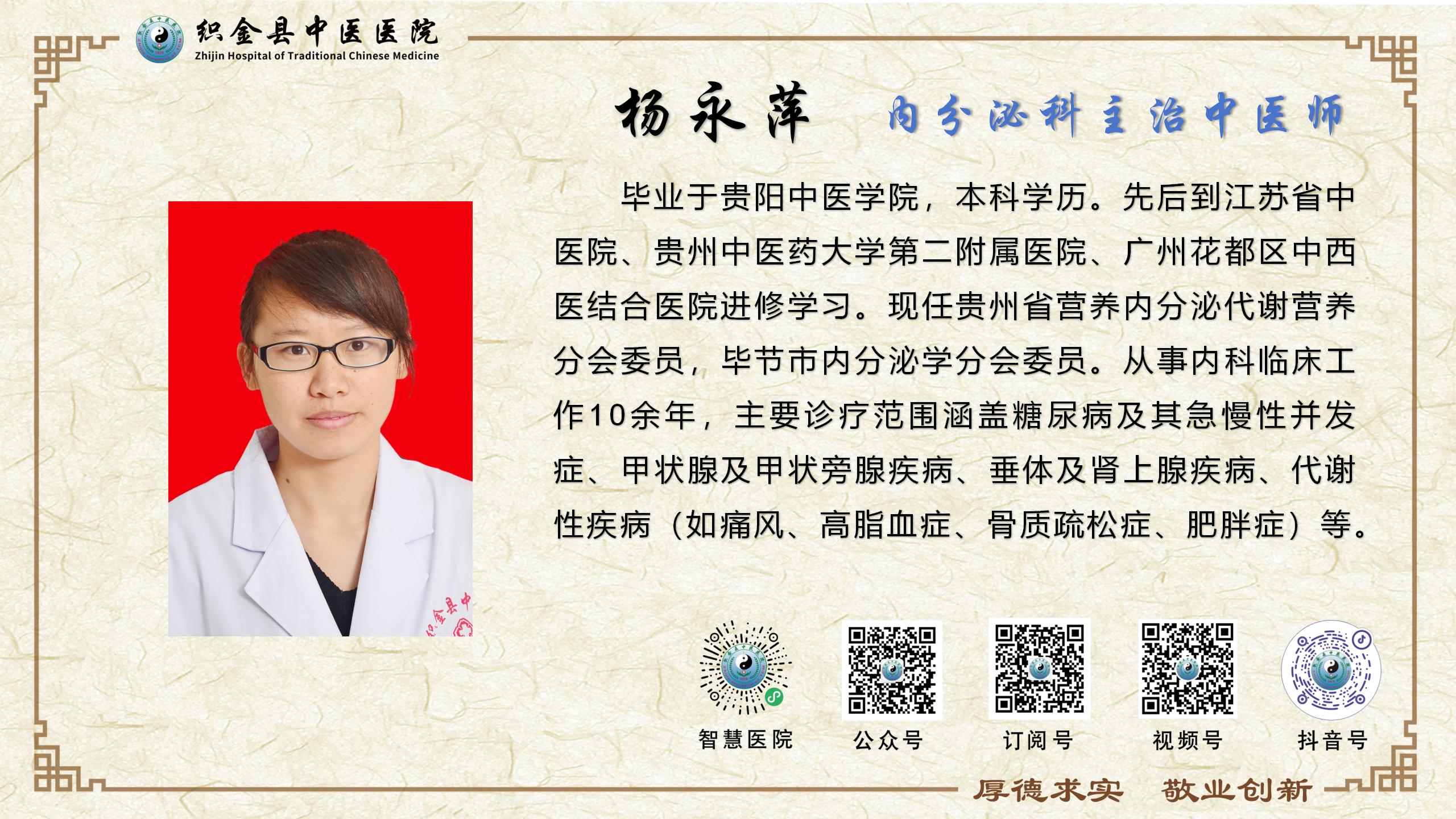 织金县中医医院内分泌科是织金县唯一的内分泌专科,是贵州省中医药管理局重点建设专科,是贵州省中医药大学第二附属医院帮扶专科。科室现有床位30张,医护人员共21人,远程帮扶专家6人,其中副主任医师1人,主治医师3人(其中研究生2人、专培生1人)。护士12人,主管护师3人,护师7人,专培护士2人。开展多项中医特色疗法(如:中药直肠滴入治疗肾病;中医推拿治疗糖尿病肠病,耳针及刮痧疗法改善甲亢及糖尿病睡眠障碍;中药膏剂外敷缓解痛风疼痛等),配置智能血糖仪、胰岛素泵等专科设备及中医离子导入、熏洗机等中医特色设备。科室以中医药或中西医结合方法诊治各种内分泌代谢性疾病,特别是在糖尿病及其并发症(如糖尿病前期、糖尿病、糖尿病视网膜病变、糖尿病周围神经病变、糖尿病肾病、糖尿病肠病、糖尿病足等)、甲状腺疾病(甲亢、甲减、甲状腺结节、亚甲炎)、骨质疏松、肥胖症、代谢综合征、痛风(难治性痛风、痛风性肾病、痛风石形成)等的中医药防治中取得了显著成效,显著降低了致残致死率,提高了生活质量,同时大幅度降低了治疗费用,得到广大患者的高度认同。