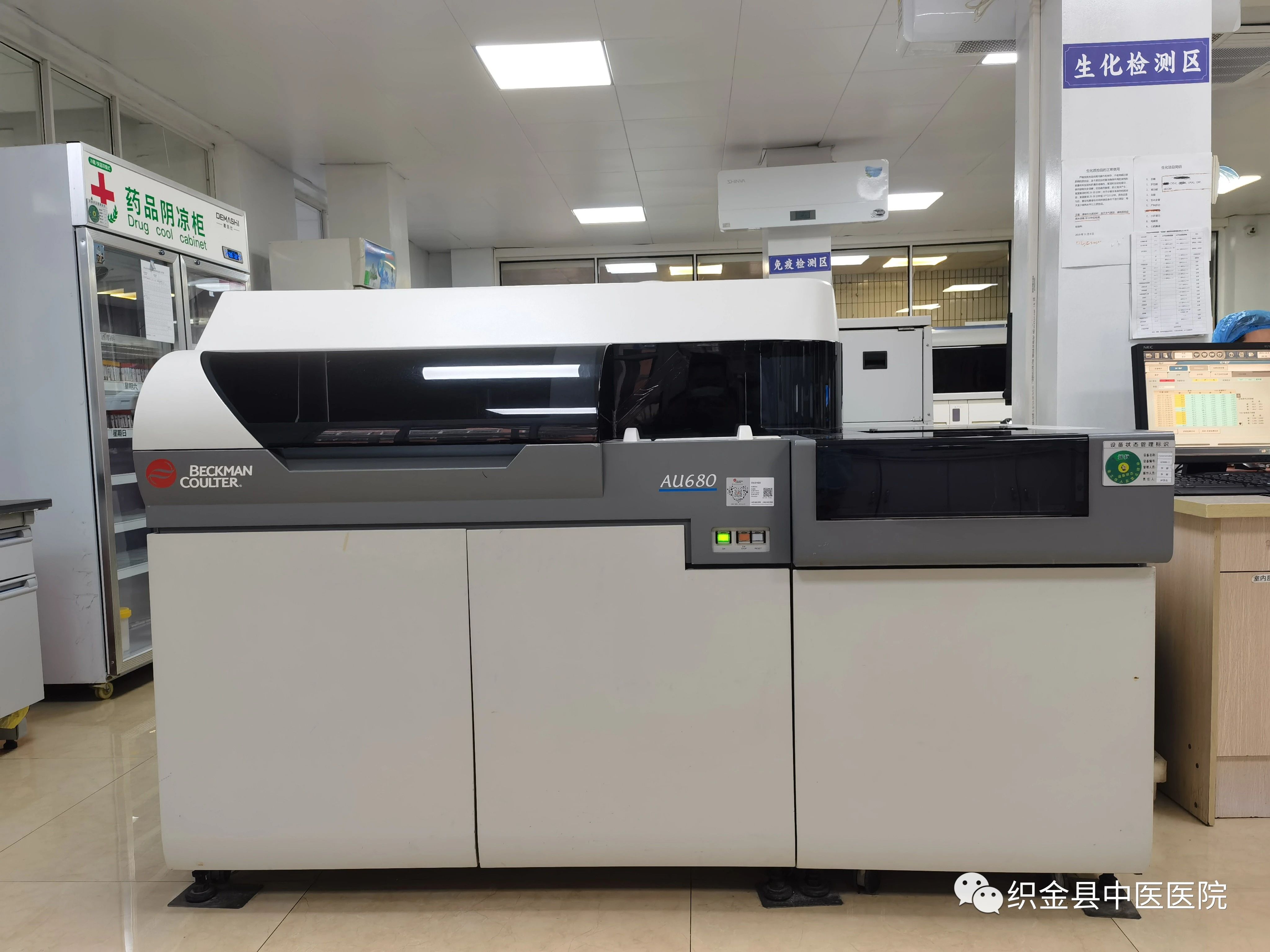 贝克曼AU-680型全自动进口生化仪:能开展肝功能、肾功能、血脂、血糖、糖化血红蛋白、心肌酶、电解质、风湿类等生化检验项目。