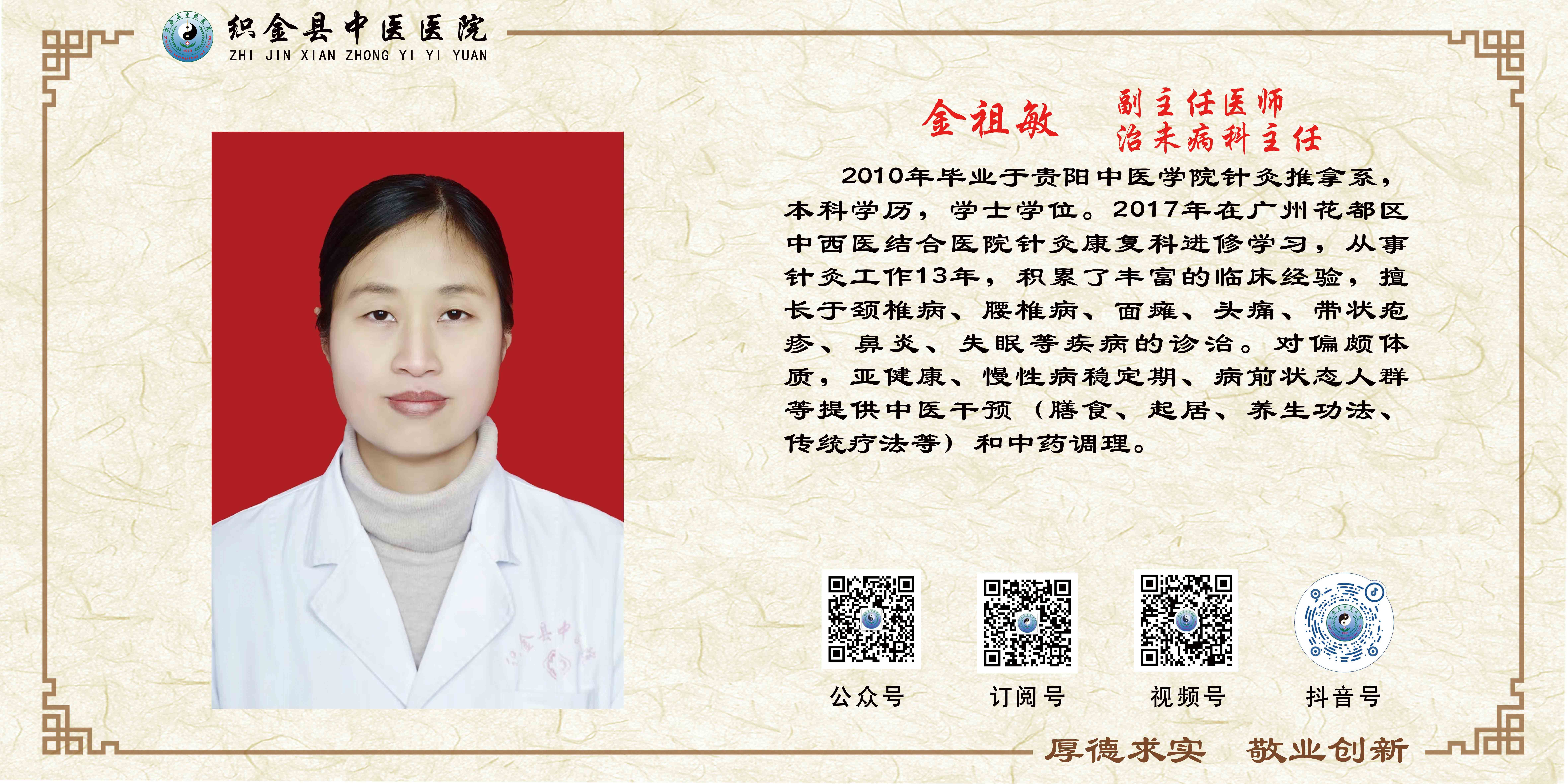 织金县中医院治未病科是根据 << 国家中医药管理局关于关于积极发展中医预防保健服务的实施意见 >>的精神要求建立起来的一级科室。治未病科充分发挥中医特色优势,围绕着“未病先防,既病防变,愈后防复”的治未病理念,运用先进的中医体质辨识仪、经络检测仪,四诊仪及现代检测手段,针对亚健康、体质偏颇、病前状态人群、慢性病稳定期人群、其他关注健康的特殊人群为服务对象,开展中医体质辨识、健康状态评估、健康咨询与指导、中药调理以及传统非药物疗法干预等,开展针对慢性疲劳综合症、睡眠障碍、颈肩腰腿痛、胃肠功能紊乱、月经不调、更年期综合症、轻度代谢异常(高血脂、高尿酸、高血糖、肥胖)等进行中医干预(膳食食疗、起居调养、养生功法、传统疗法等)和中药调理。